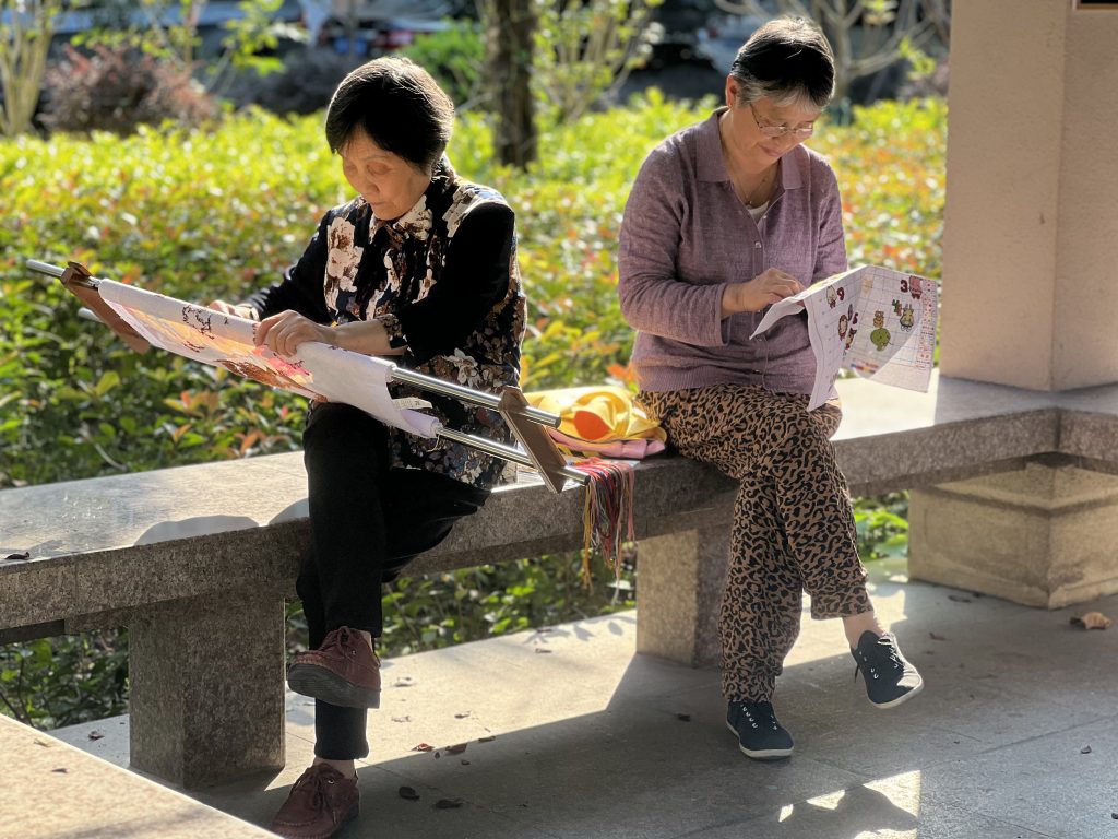 于是在这个温暖的午后,嘉绿苑社区组织了一场小型茶话会,邀请了王叔叔十字绣小组的老成员们,大家一起喝茶谈天,一边唠着家常,一边绣着花,“还是得跟王师傅一起绣才行,我们自己真没这个毅力,王师傅指导一下就是不一样喏”傅阿姨指着自己的作品,给王师傅竖起了大拇指。